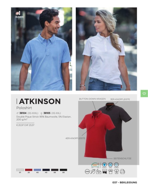| ATKINSON BUTTON-DOWN KRAGEN 3ER-KNOPFLEISTE Poloshirt m 38104 (XS-XXXL) f 38105 (XS-XXL) Double Pique Strick 95% Baumwolle, 5% Elastan, 200 g/m² € 20,97 CHF 23,07 4ER-KNOPFLEISTE SEITENSCHLITZE 01 25 40 49 89 99 037 - BEKLEIDUNG