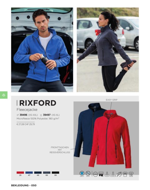 | RIXFORD EASY GRIP Fleecejacke m 39496 (XS-XXL) f 39497 (XS-XL) Microfleece 100% Polyester, 180 g/m² € 27,08 CHF 29,79 FRONTTASCHEN MIT REISSVERSCHLUSS 25 47 49 89 99 BEKLEIDUNG - 050