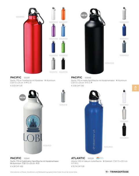 Pacific 770 ml Sublimation Sportflasche mit Karabinerhaken Atlantic 530 ml Vakuum Isolierflasche Edelstahl Ø 7.3 x 25.5 cm