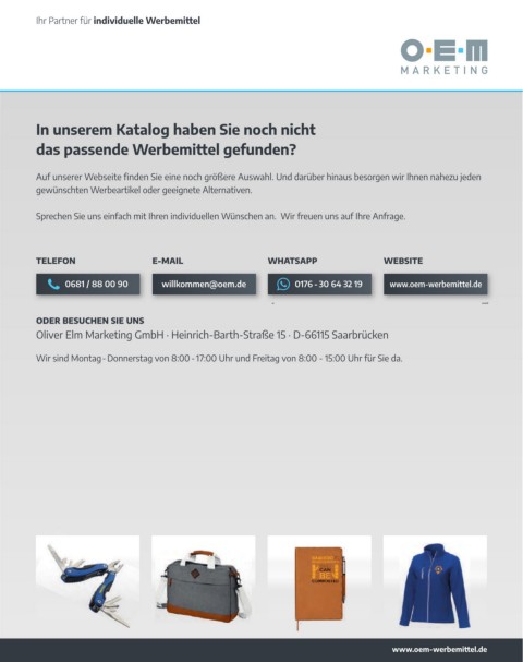 0681 / 88 00 90 willkommen@oem.de 0176 -30 64 32 19 www.oem-werbemittel.de